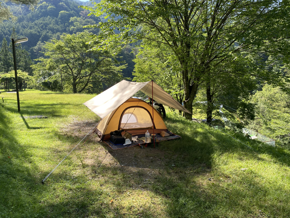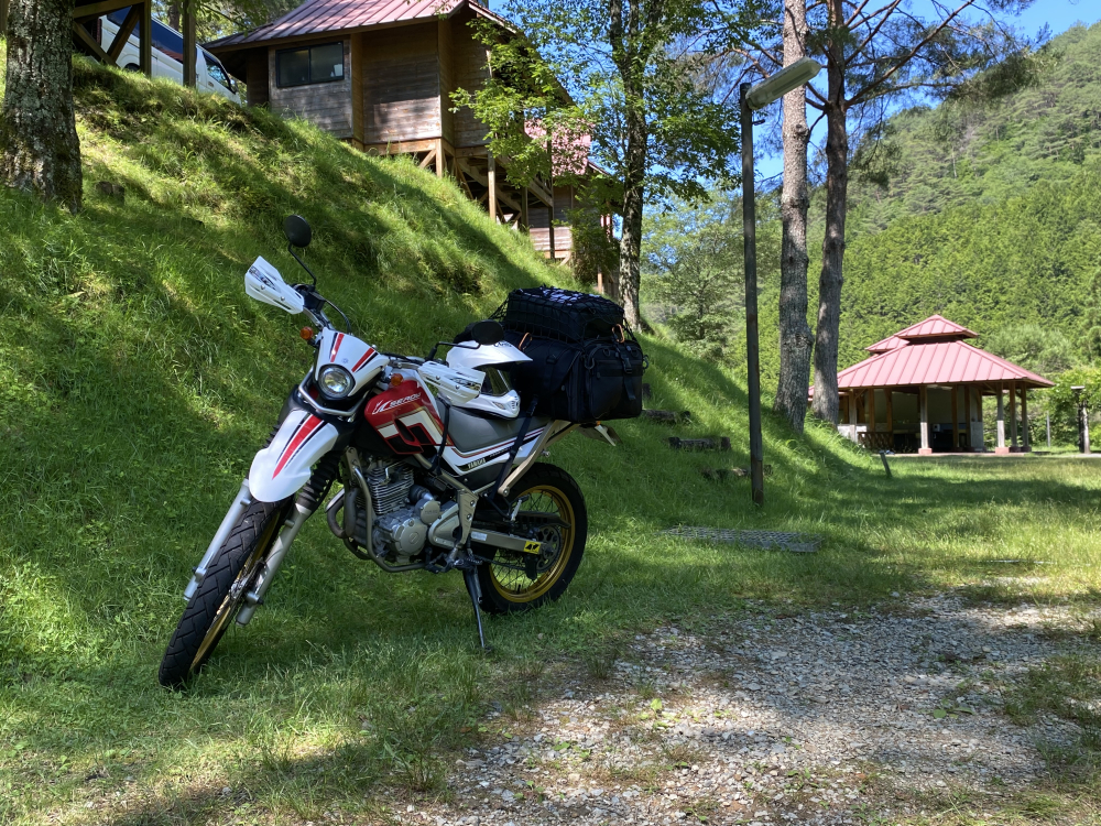 途中ガタガタのせませまでドイヒーな道になるのですが、そういう道が好きなのであえてそのルートで。道程の半分ぐらいは信号も交通量も少ない道なので、酷道が気にならなければ快適。やっぱりキャンプツーリングっていうからにはこうでないと。